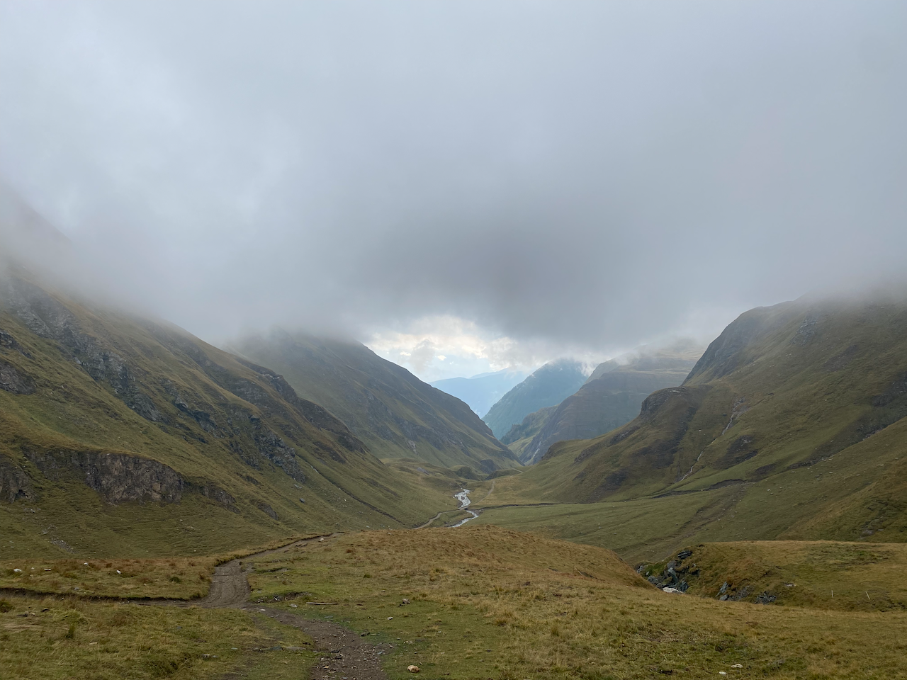 Der Blick auf das regenverhangene Gebirge über der Brixener Hütte geht auch in Richtung morgiger Wanderung, die technisch anspruchsvoll und konditionell fordernd sein wird.